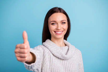 Portrait of charming cheerful cute adorable lady raise thumb up reliable agreement on blue background