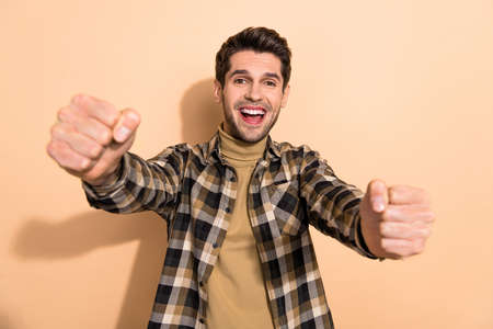 Photo of amazed crazy guy hold hands imagine drive fast speed race auto isolated pastel color background