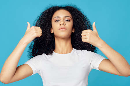 Woman with black curly hair white t-shirt showing thumbs up blue background