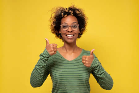 Charming friendly African American woman makes peace sign over eye smiles broadly and feels positive emotions sends good vibes wears bright green t shirt People emotions : Generative AI