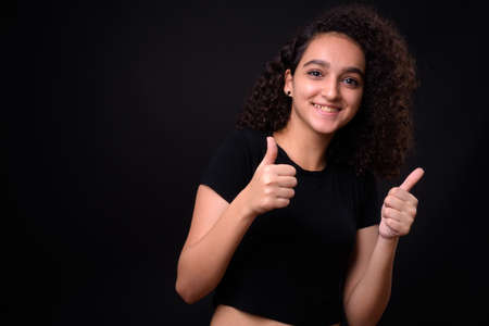 Closeup portrait of brunette girl on dark background. Supportive emotional lady cheering with thumbs up. Happy facial expression.