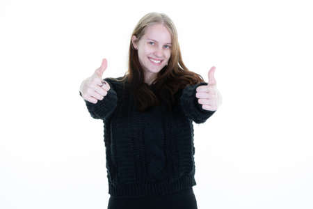 Cheerful beautiful young woman looking at camera while showing thumb up or like sign against white studio background for copy space
