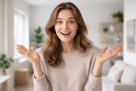 A woman is smiling and raising her hands in excitement in a well-lit indoor space with plants and simple furnishings.