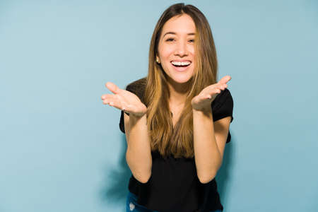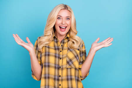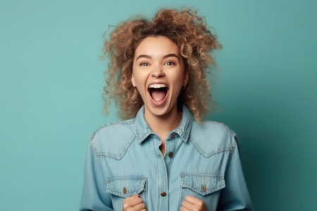 Happy girl raising palms scream on blue color background, Yeah.