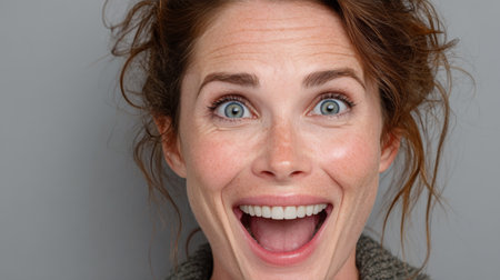 Surprised woman showcasing wide open eyes and mouth, expressing genuine excitement and joy in a cheerful, candid portrait
