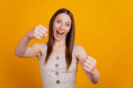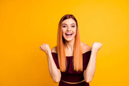 Close up portrait of joyful girls celebrate the victory by hold her hands in fists looking at camera and smiling broadly isolated on yellow background