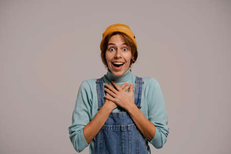 Photo of cute female hipster looks surprised and happy about news. White woman wears denim overall and hat isolated grey color background