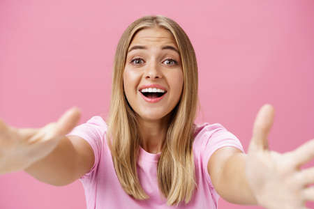 Close-up shot of caring and loving silly girl with tanned skin and fair hair pulling hands towards camera to give warm hug smiling broadly gazing with admiration wanting cuddle over pink background