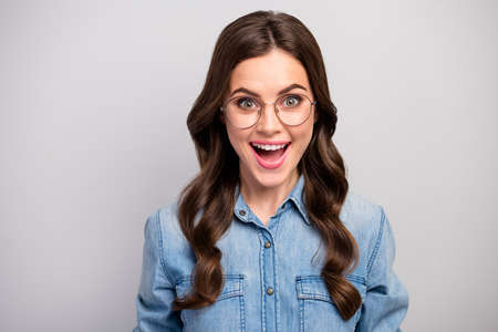 Closeup photo of pretty excited business lady open mouth listen positive good mood long curly hairdo wear specs casual jeans shirt isolated grey color background