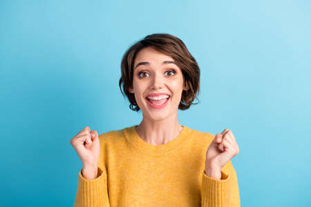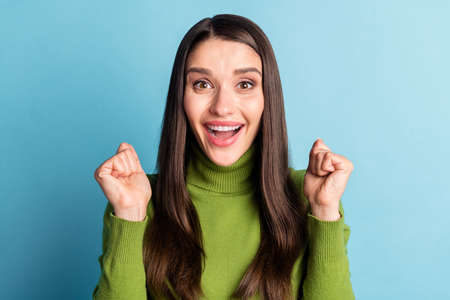 Photo of overjoyed lady raise fists best win rejoice wear sweater isolated vibrant color background