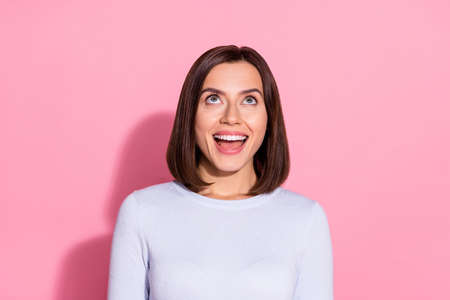 Photo of adorable impressed young woman wear white sweater looking up empty space smiling isolated pink color background.