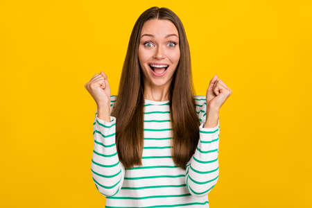Photo of sweet lucky woman wear striped shirt screaming rising fists isolated yellow color background