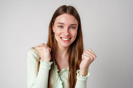 portrait of a cute brunette girl rejoices victory with clenched fists