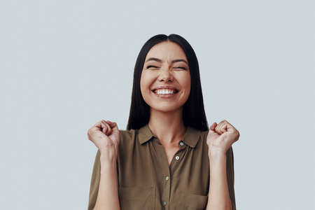 So happy! Beautiful young Asian woman gesturing and smiling while standing against grey background