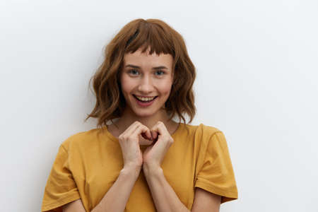 beautiful, attractive, redhead, romantic a woman poses standing in a yellow T-shirt on a white background and shows a heart sign with her fingers, smiling broadly and looking at the camera