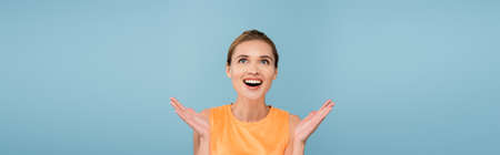 excited woman in orange singlet looking up isolated on blue, banner