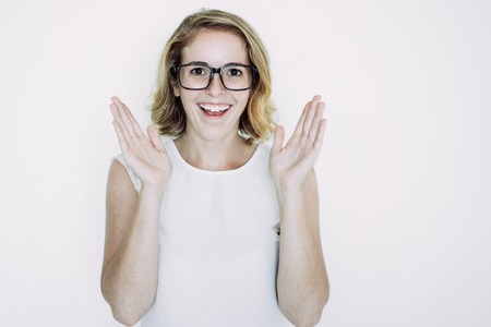 Portrait of a excited woman with positive emotions - on white background