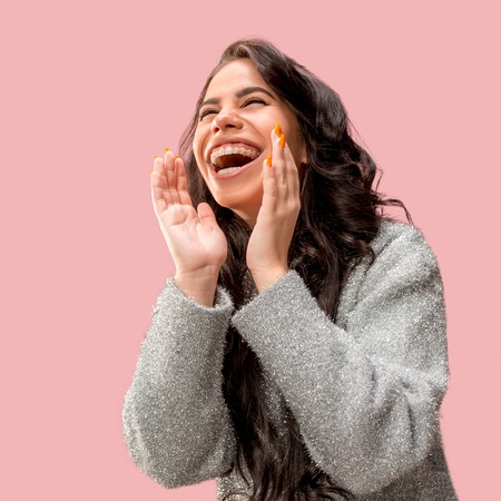 Portrait of a beautiful young woman laughing and looking at camera against grey background