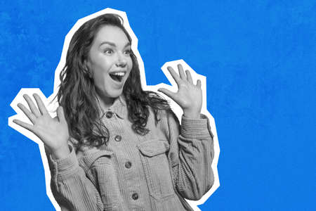 Amazed young lady looking at copy space and gesturing, collage