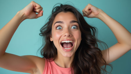Joyful Young Woman Celebrating Success with Enthusiastic Expression in Casual Attire.