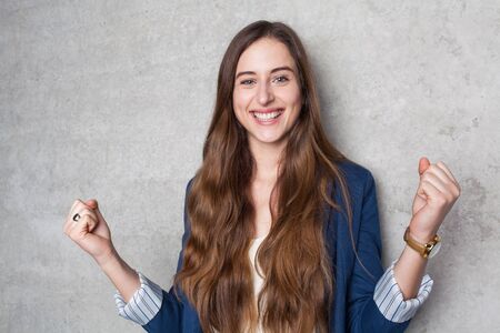 Overjoyed young cute young business woman smiling with joy celebrating win success isolated on gray background. Portrait happy girl.