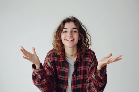 A woman wearing a flannel shirt and with long hair holds out her hands in a straightforward pose.