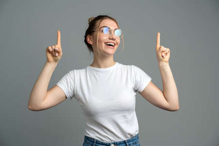 Positive girl shows index fingers up. Girl with glasses posing on a gray background. Copy space, blank wall