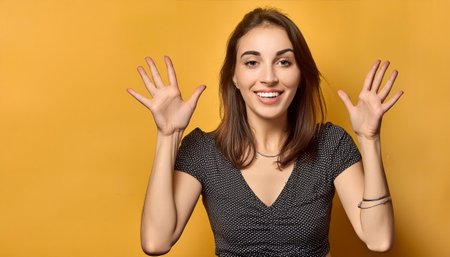 girl receiving a pleasant surprise, excited and raising hands. High quality photo