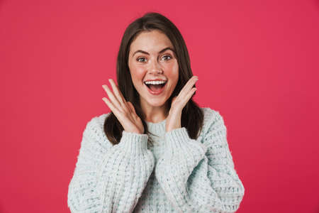 Image of excited beautiful girl expressing surprise on camera isolated over pink background