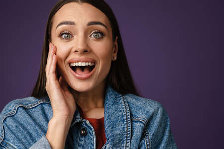 Excited beautiful brunette girl expressing surprise at camera isolated over purple background