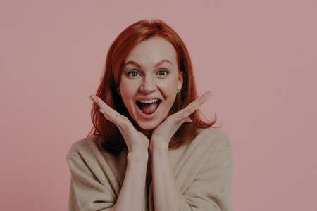 Wow! Portrait of young surprised beautiful ginger woman spreading palms near face and keeping mouth open from excitement, isolated over studio background, dressed in casual clothes. Surprise concept