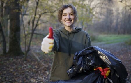 Portrait of a socially active volunteer woman with a garbage bag in the woods. The concept of the right way of life