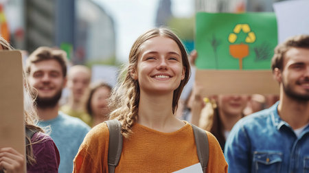 A joyful group of people gathers at a rally, holding banners and signs. Their expressions reflect positivity and unity, emphasizing community engagement and activism.