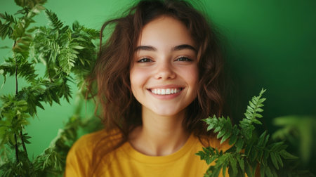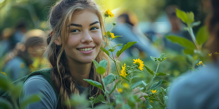 A joyful young woman stands in a lush garden wearing a recycling shirt and encouraging eco friendly practices.