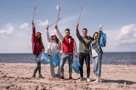 Diverse group of volunteers cleaning up beach, holding bags of collected waste. Concept of environmental activism, community engagement, sustainability. Perfect for eco-campaigns, nature conservation