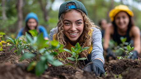 Portrait of happy young women planting trees in the garden. Selective focus.