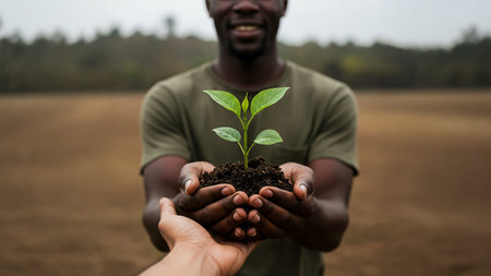 Group of diverse hands protecting a young tree sapling in forest sunlight, symbolizing teamwork, conservation and environmental care.