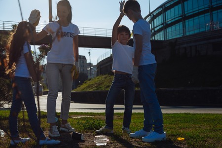 Motivated happy group of people sharing high five with her friends, finishing litter cleanup of the forest and saving the nature. Satisfied activists congratulating and praising each other.