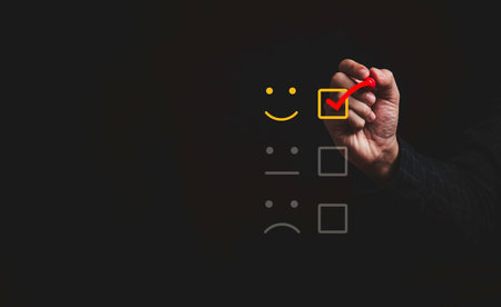 Businessman tick mark to select smile button for the best evaluation , customer satisfaction concept.