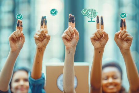 Group of diverse individuals with their hands raised high, showcasing digital symbols of approval and global connection.
