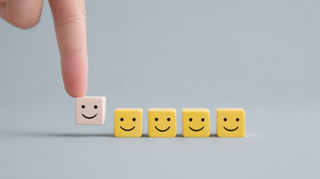 Persons hand picks up a wooden block with a smiling face, representing a choice for happiness or positive customer satisfaction