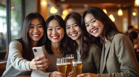 Four friends gather in a warm bar, smiling brightly while taking a selfie with their phones. They enjoy beers together, creating a lively atmosphere filled with joy and laughter.