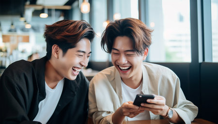 Two Asian handsome young male friends having fun with social media on smartphone. Laughing together Cheerful and overjoyed young Asian male millennial, gen z,gay couple Asia