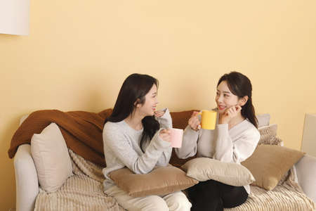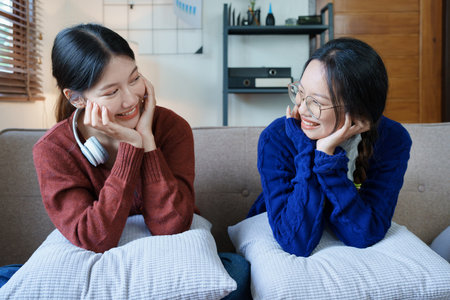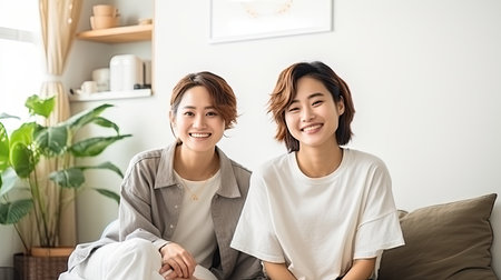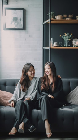 Generative AI : Candid of young attractive asian women couple in living room hugging with love together sitting on sofa couch Two sister best friends lesbian lifestyle or moment of