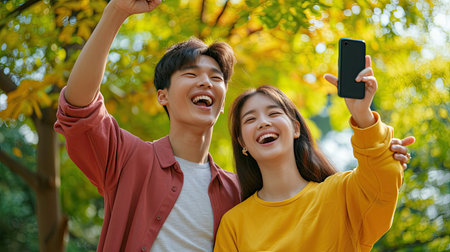 Happy excited Asian couple looking at smartphone and raising his arm up to celebrate success or achievement