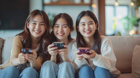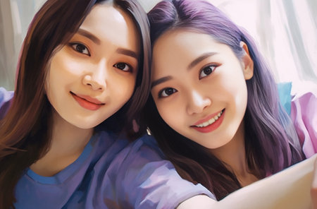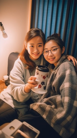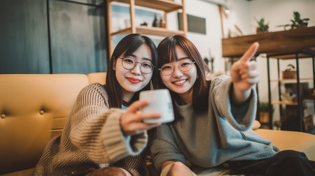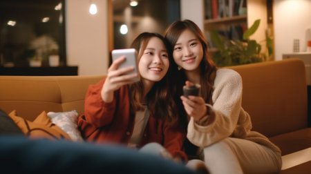 Generative AI : POV attractive beautiful two people asia young lady girl hold mobile phone take photo picture video camera overjoy sit at home sofa couch good time day together qua