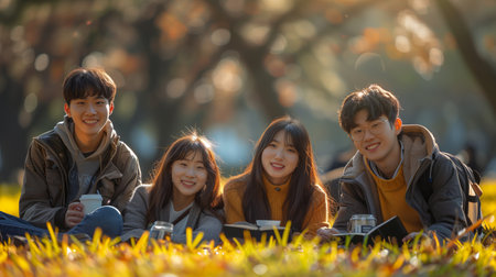 Four College Students Studying In A Park On A Sunny Autumn Day