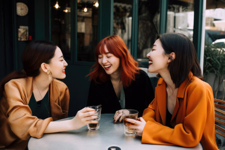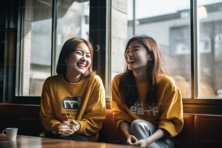 Group of laughing friends sitting together at cafe table in a coffee shop and chatting. Generative AI