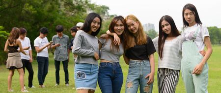 Generative AI : Three asian women laughing and smiling in park Group Of Friends Having Fun Together Outdoors Enjoy moment of friend during walking and camping together Lifestyle an