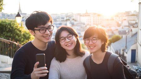 Global smiles: capturing joy in group selfies of cheerful and happy young people diverse nationalities, celebrating unity, friendship, cultural harmony in shared moments of happiness and togetherness